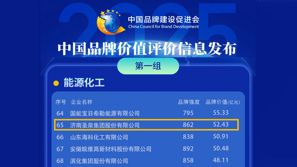 近日,由中国品牌建设促进会、中国资产评估协会主办,新华社品牌工作办公室、《中国品牌》杂志社等承办的“2025中国品牌价值评价信息”在浙江德清发布。济南圣泉集团股份有限公司品牌价值逐年递增,以52.43亿元荣登能源化工行业榜单,位居第65位。