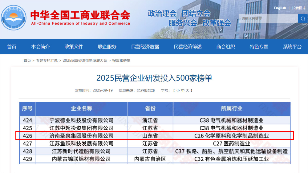 圣泉集团入围“2025民营企业研发投入500强”榜单