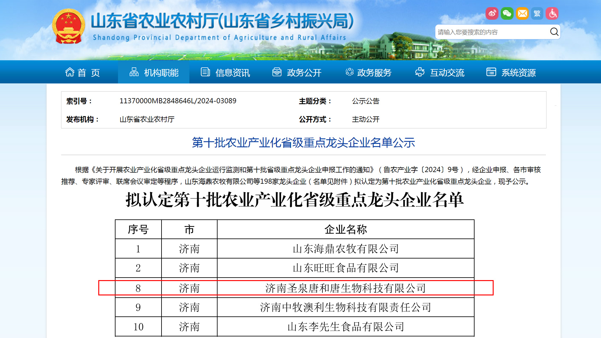 近日,山东省农业农村厅下发《第十批农业产业化省级重点龙头企业名单公示》,经企业申报、各市审核推荐、专家评审、联席会议审定等程序,济南圣泉唐和唐生物科技有限公司完善的产品服务体系及卓越的品牌形象成功入选第十批农业产业化省级重点龙头企业。
